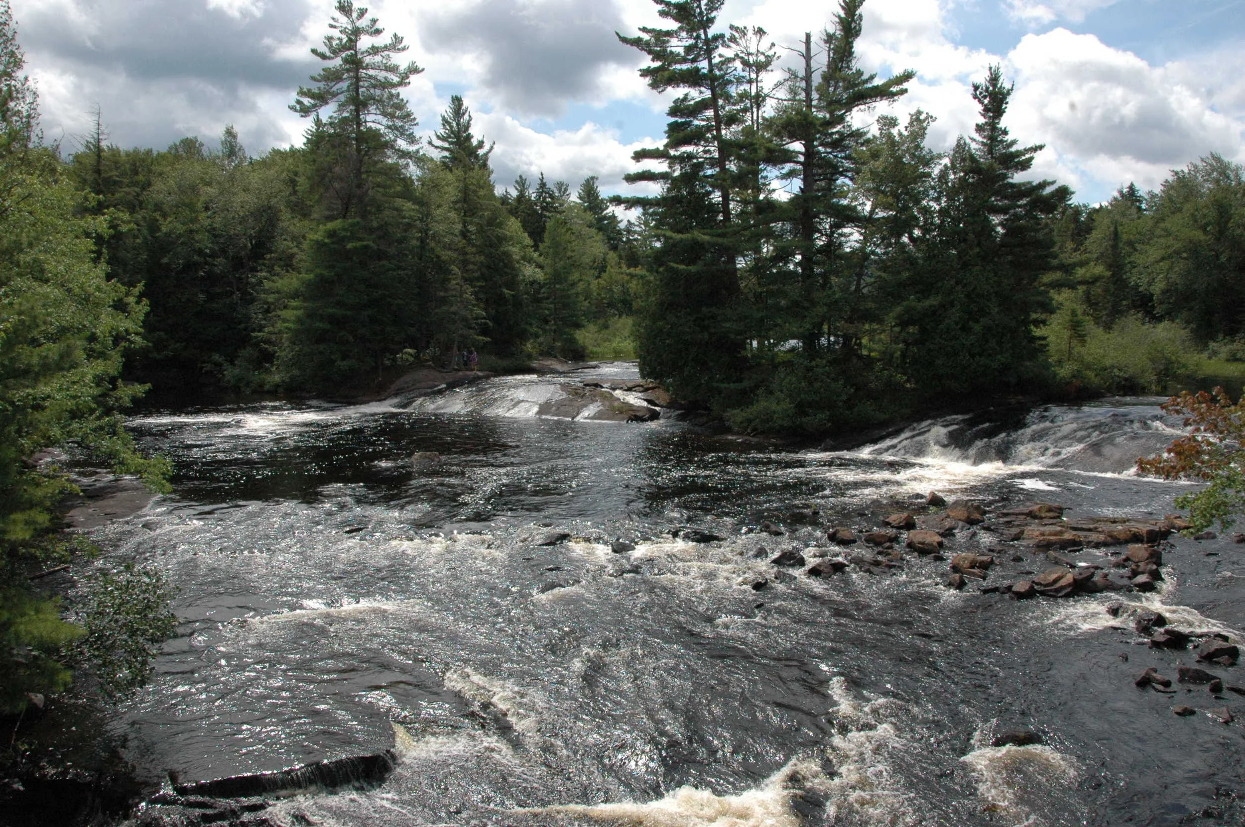 Head south out of the town of Tupper Lake on Route 30. You will follow Rte 30 along the east edge of Tupper Lake (the lake, not the town) for about 8 miles to the junction with Route 421. Turn right on 421, winding northwest till you cross a bridge; there is a small set of parking spaces to the immediate left of the bridge. While on the bridge, to your left (SW), you will see the first of the Bog falls, the end of the Bog River and the falls you can actually play on. On the NE side of the bridge is a larger, more formidable, falls where the Bog dumps into Tupper Lake. This latter falls is not a waterfall for human funtime.